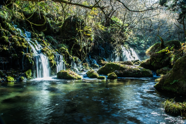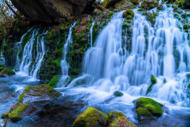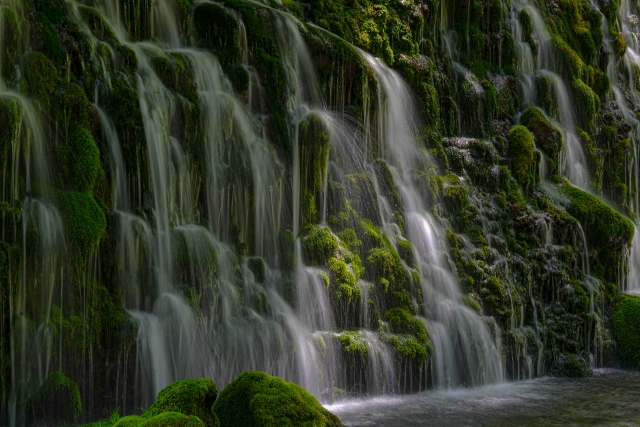 - 水温約8℃の清流が、苔むす岩肌から無数の糸のように流れ落ちる幻想的な滝