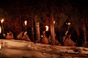 (炎が雪を照らし、なまはげたちが松明を高く掲げる。)