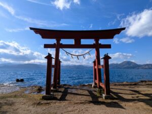 - 湖畔のたつこ像と御座石神社が伝説と信仰の中心地。