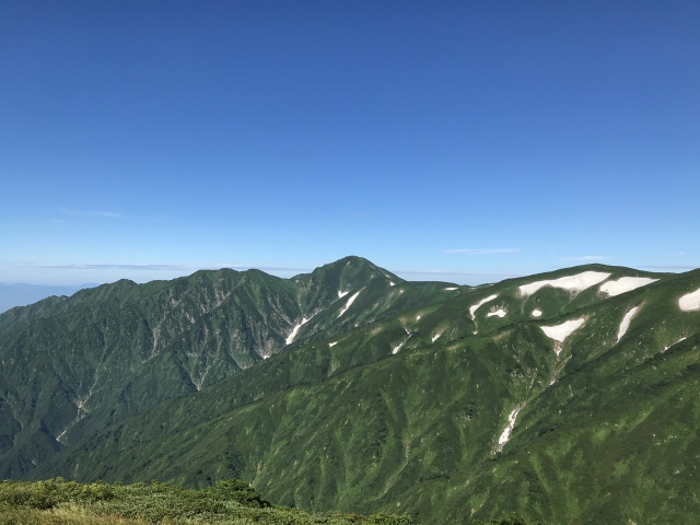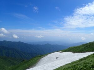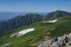 - 雪渓と草原の対比が美しい