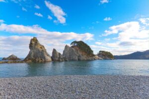 アン「ここが浄土ヶ浜。約350年前に僧・霊鏡が“まさに極楽浄土のごとし”と称えたことから名付けられたの。岩の正体は石英閃緑岩で、風化と波に削られてこの独特の形になったのよ。」